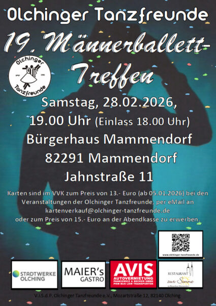 Karten zu 13,- Euro im VVK gibt es unter kartenverkauf@olchinger-tanzfreunde.de oder bei den Veranstaltungen der Olchinger Tanzfreunde.